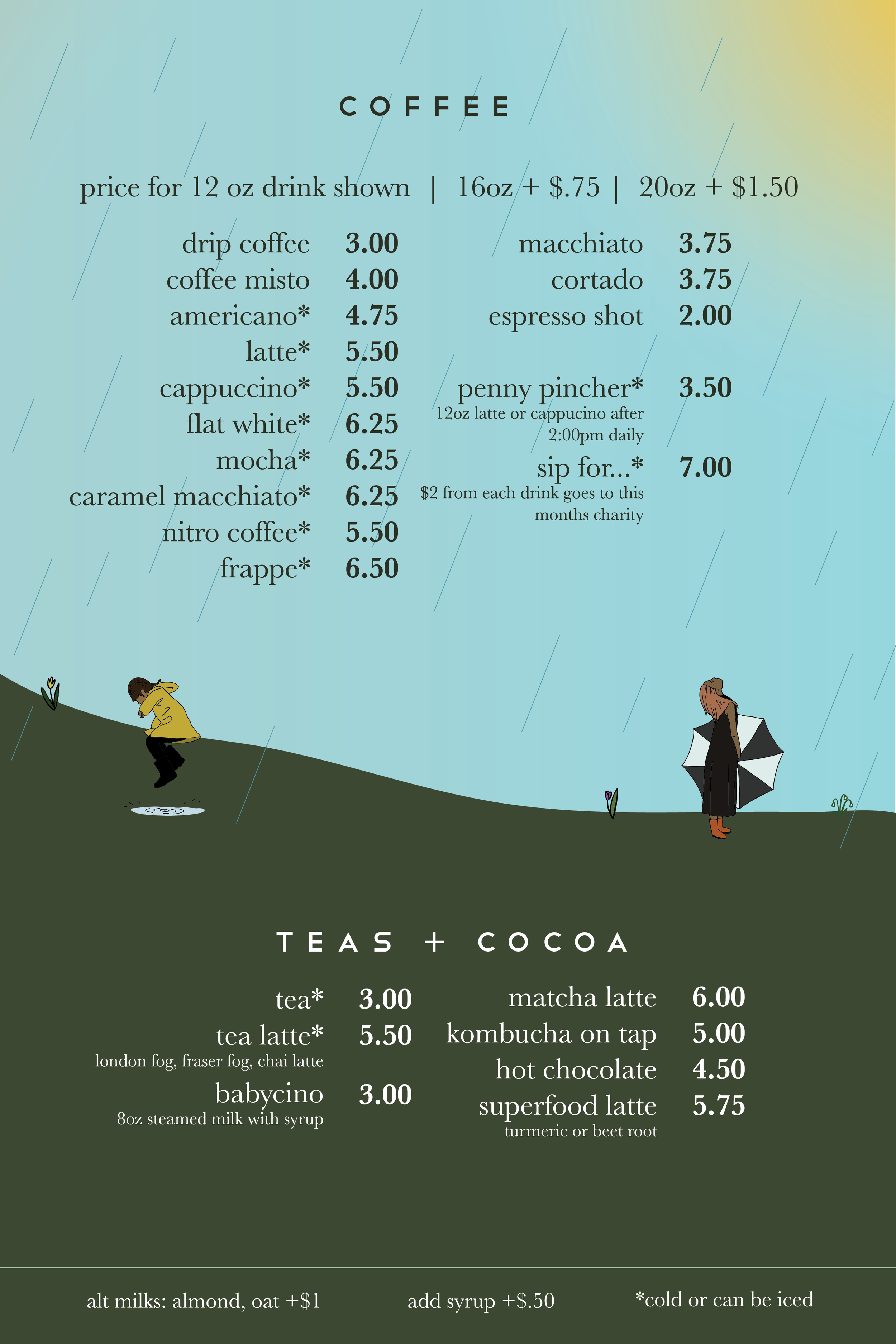 Our tea comes from a great local maker, Karla’s Specialteas. Karla hand-blends each delightful tea with the finest leaves and herbs and sometimes, as with her Missions Communitea, includes wildly harvested local herbs. Try our Fraser Fog, which is a tea latte made with Communitea with a subtle honey drizzle, perfect parts calming and energizing